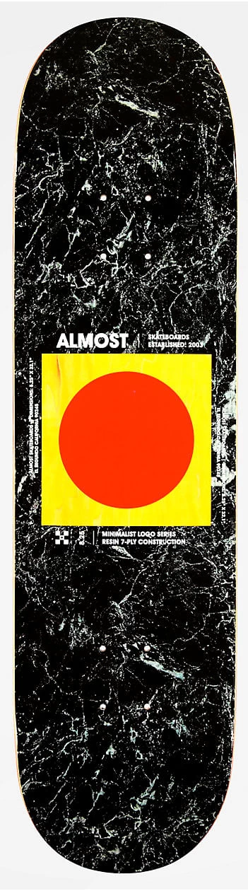 Build up the perfect board with the Almost Minimalist R7 Skateboard Deck. The Resin-7 Canadian Maple construction uses an epoxy that allows for more strength with less glue, making it lightweight, stiff and long lasting. This Almost Skateboard Deck was specifically designed for durability and performance. The Resin deck is lighter and keeps it’s pop longer than normal water based decks.