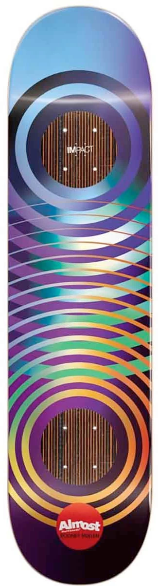 Build up the perfect board with the Almost Mullen Gradient Rings Impact Skateboard Deck. The Impact Support construction uses 8 ply maple and an epoxy that allows for more strength with less glue, making it lightweight, stiff and long lasting. This Almost Skateboard Deck was specifically designed for durability and performance. The Resin deck is lighter and keeps it’s pop longer than normal water based decks.