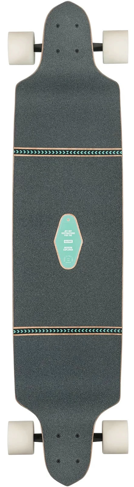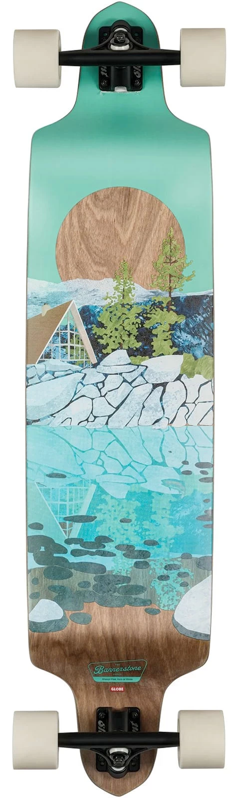 A cassic drop-down, twin-tip longboard with slight side-to-side concave, the Globe Bannerstone Longboard is a down-hill and cruising longboard featuring hard rock maple 8-ply deck with artwork by featured artist Sterling Bartlett. Featuring 180mm Slant reverse kingpin longboard trucks with reversible 50/54 degree hangers – they come at 50 degrees for stability at high speeds, or can be flipped to 54 degrees for even tighter turns. Globe’s high-rebound 72mm 78a Conical Cruiser wheels are abrasion resistant, smoother, faster, and provide excellent grip. Finished with black die-cut grip tape with top art.
