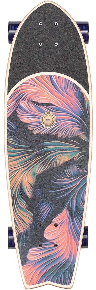 The Globe Sun City Longboard is a mid-sized, surf-inspired swallow tail cruiser with deck and grip tape artwork by featured artist Sam Chirnside. With a mellow concave and kicktail, the deck is constructed from Resin-7 hard rock maple and features an embedded metal badge detail. Featuring 5.25 Tensor alloy trucks and 62mm 78a wheels.