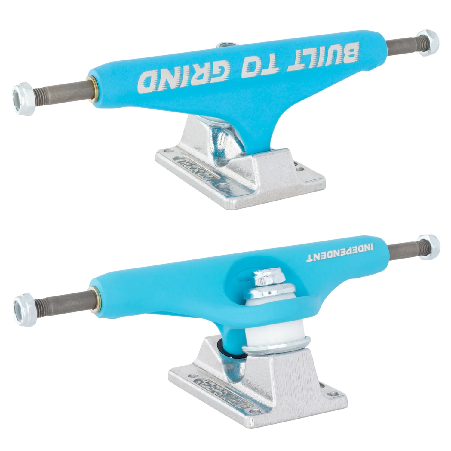 Independent BTG Speed Trucks feature flat light blue hanger with Built to Grind laser etched logo and polished silver baseplate, silver hardware, and white cushions.