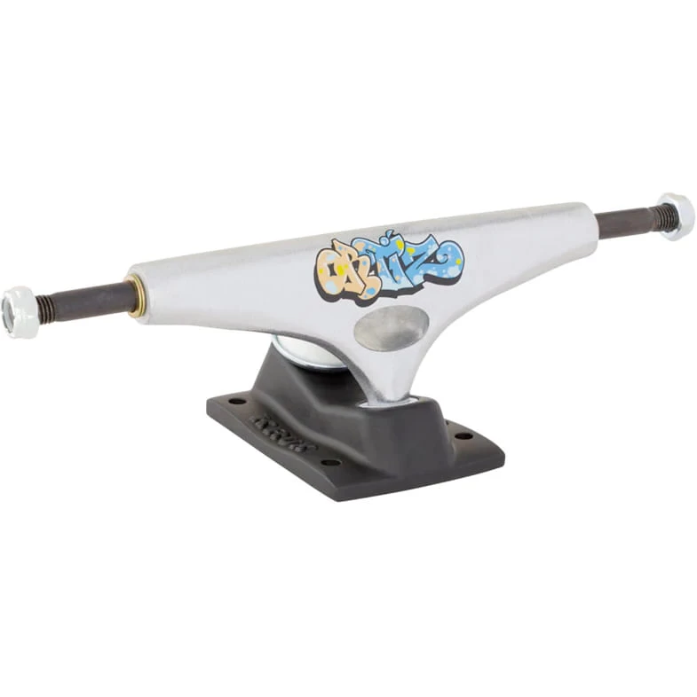 The Krux K5 Chaz Ortiz DLK Standard Skateboard Trucks feature original graffiti artwork by Sean Renos @renosoner on polished silver hanger, black baseplate, silver hardware and white cushions.