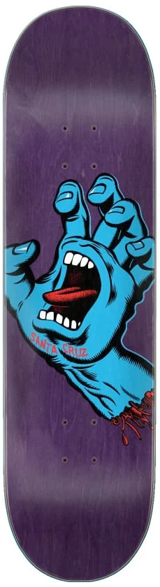 The Santa Cruz Screaming Hand Skateboard Deck on 7 ply North American Maple is pressed individually using epoxy making a strong, responsive deck with long lasting pop and consistent concave and kick, topped off with our signature matte finish.