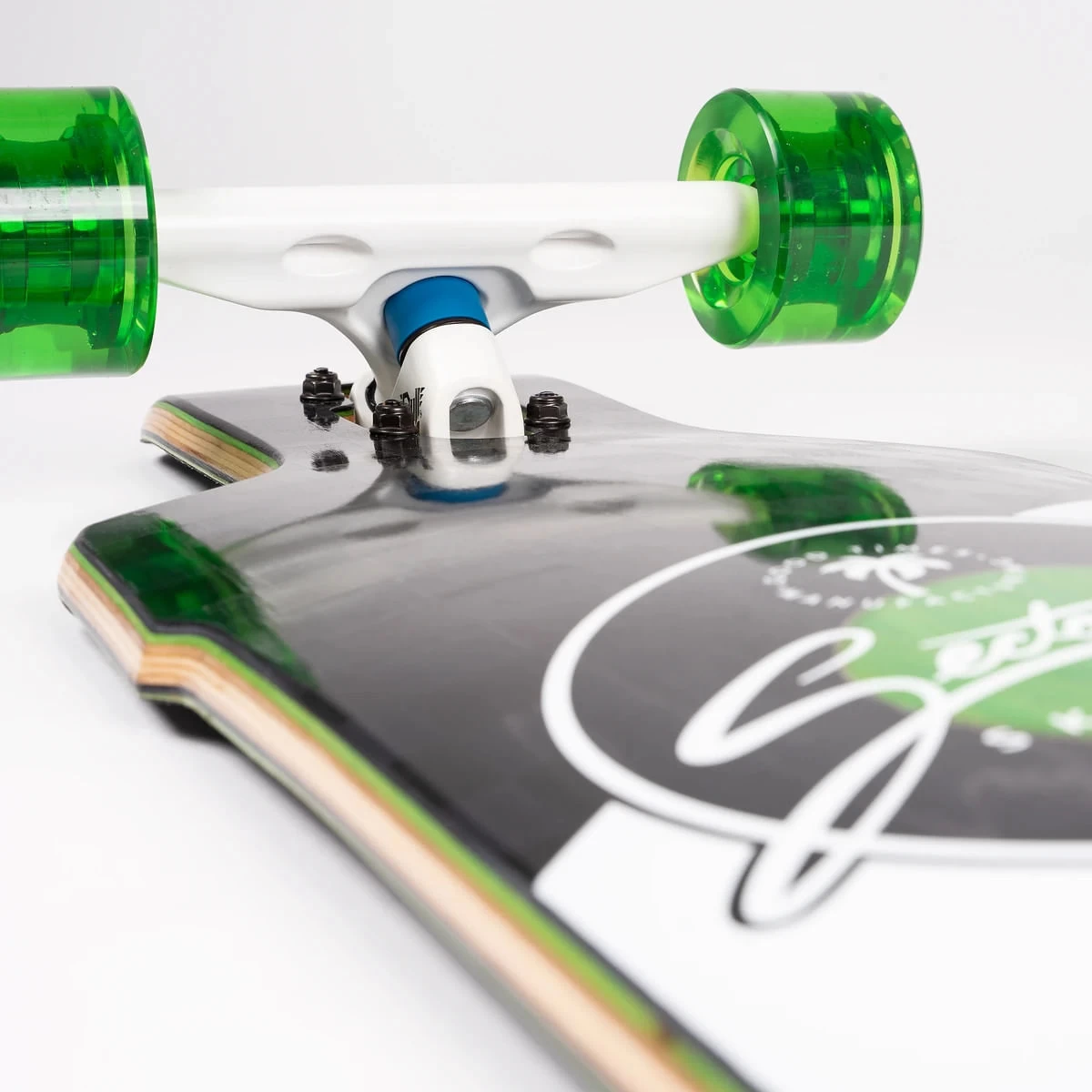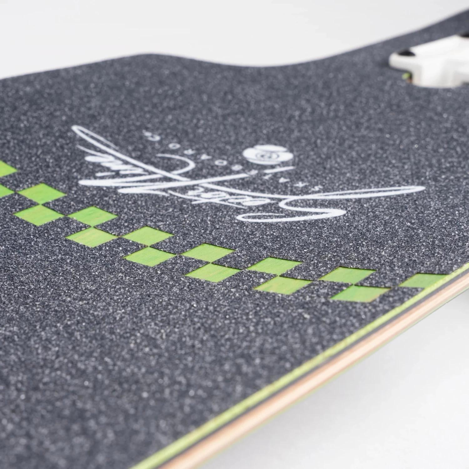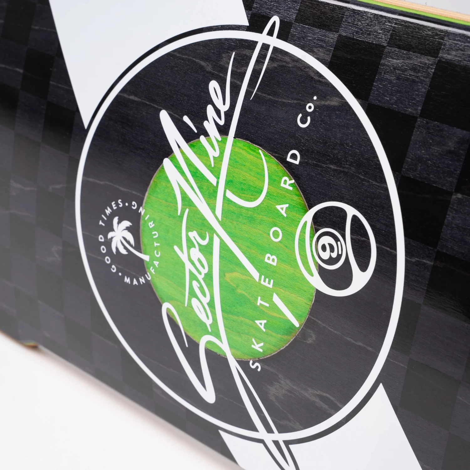 For the Sector 9 Mosaic Dropper Longboard, Sector 9 took inspiration from classic 70’s, Southern California style. The black Maple bottom plies are covered in subtle checkers, and clean, white lines reminiscent of the adolescence of the surf/skate scene. They mixed old school (Fat Wave) with classic Sector 9 (Ledger) and topped it off with new-age performance (Dropper) for an incredibly well-rounded quiver. Details like inlayed colored Maple in the bottom ply, checkered die-cut grip and matte, white trucks take these boards to the next level.